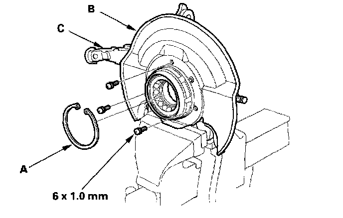 3. Remove the snap ring (A) and the splash guard (B) from the knuckle (C).