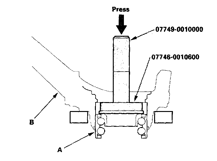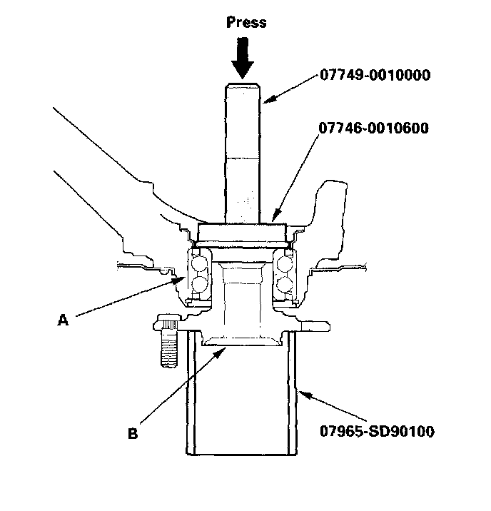 5. Press the wheel bearing (A) out of the knuckle (B) using the special tool and a press.