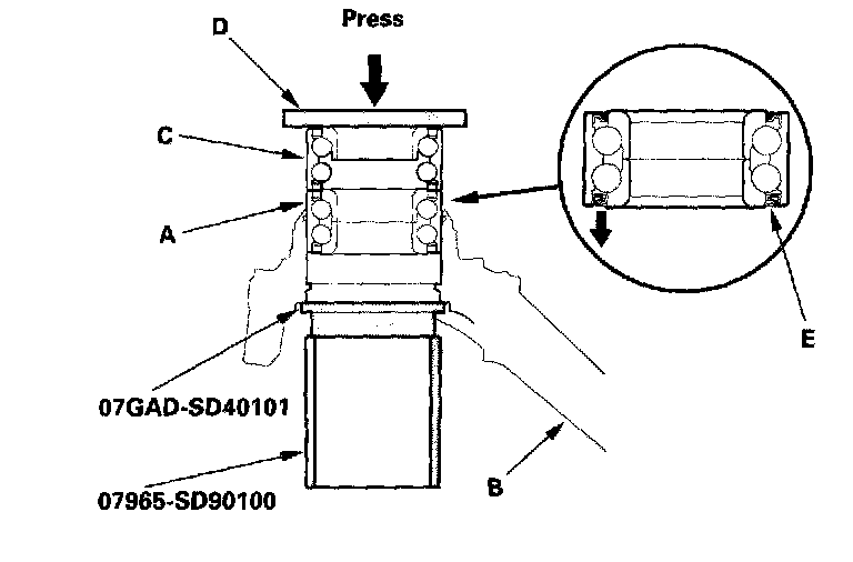 7. Press a new wheel bearing (A) into the knuckle (B) using the old bearing (C), a steel plate (D), the special tool, and a press.