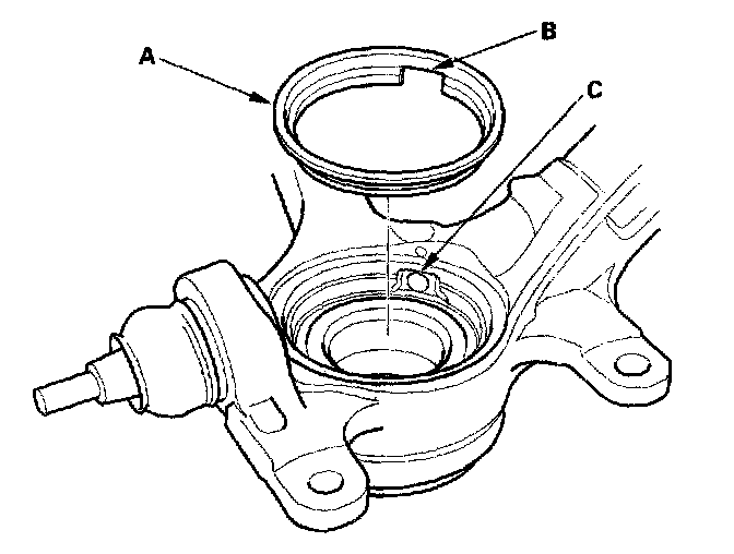 8. Install the new front knuckle ring (A) on the inside of the knuckle by aligning the cutout portion (B) on the ring with the wheel sensor hole (C) in the knuckle. Be careful not to damage or deform the ring when installing it.