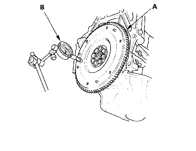 3. Measure the flywheel (A) runout using a dial indicator (B) through at least two full turns with the engine installed. Push against the flywheel each time you turn it to take up the crankshaft thrust washer clearance. If the runout is more than the service limit, replace the flywheel and recheck the runout. Resurfacing the flywheel is not recommended.