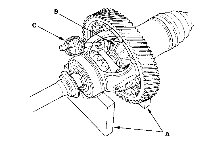 Backlash Inspection1. Place the differential assembly on V-blocks (A), and install both axles.