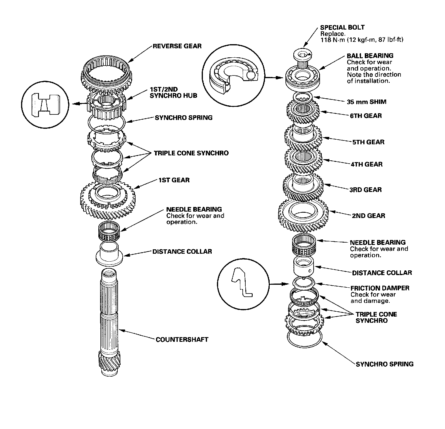2. Install the distance collar and needle bearing onto the countershaft.