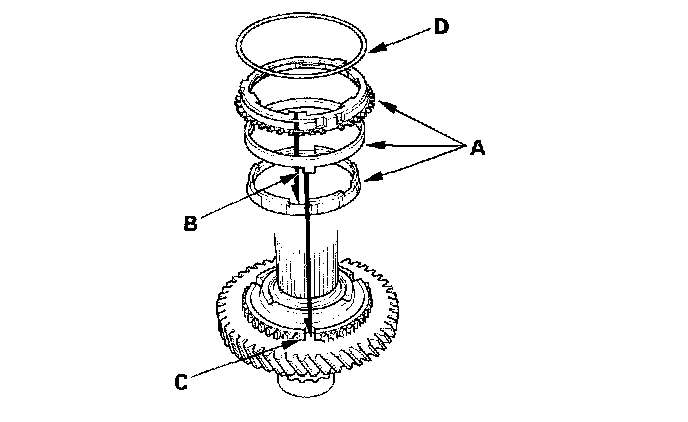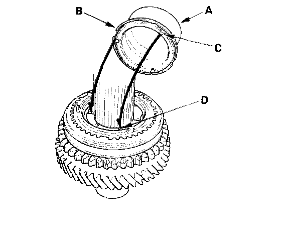 3. Install the triple cone synchro assembly (A) by aligning the synchro cone fingers (B) with 1st gear grooves (C), then install the synchro spring (D).