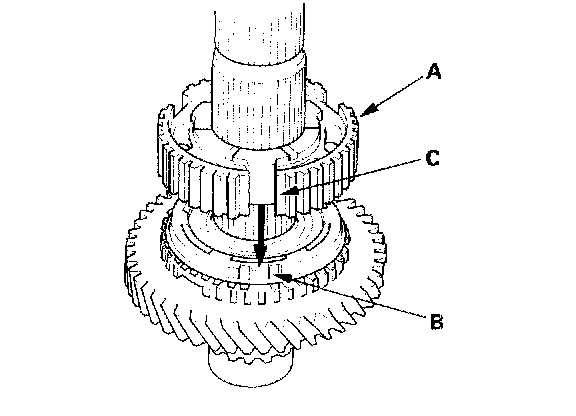10. Install the 2nd gear (A) by aligning the synchro cone fingers (B) with the 2nd gear grooves (C).