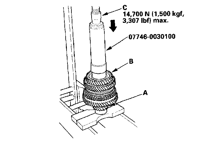 11. Support the countershaft (A) on the steel blocks, then install 3rd gear (B) using the special tool and a press (C). Do not exceed the maximum pressure.