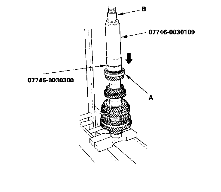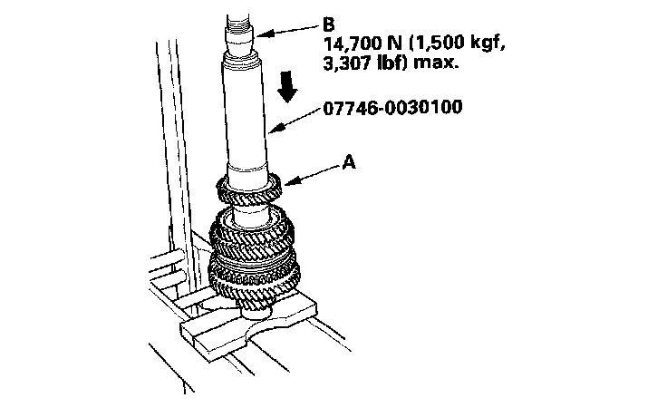 13. Install the 5th gear (A) using the special tool and a press (B). Do not exceed the maximum pressure.