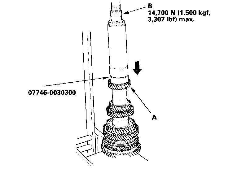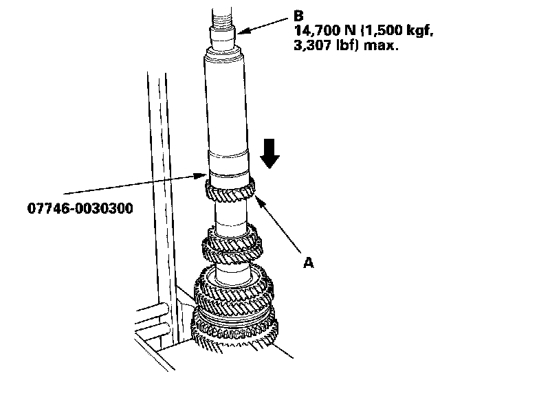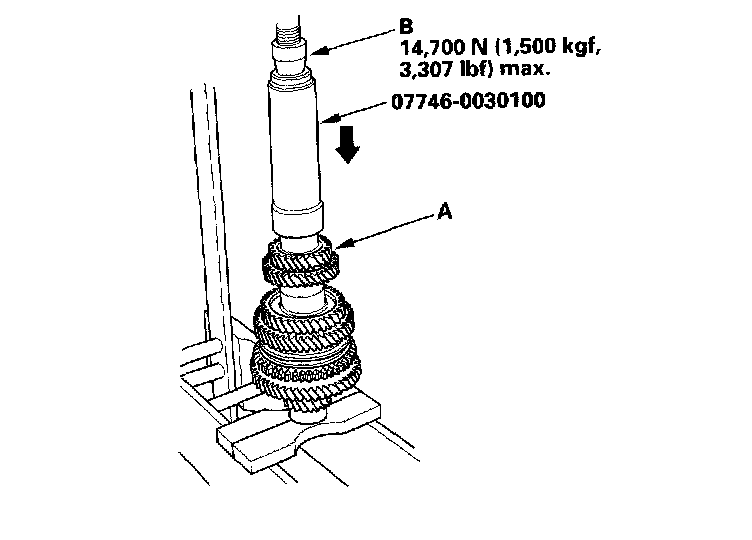 12. Install the 4th gear (A) using the special tool and a press (B). Do not exceed the maximum pressure.