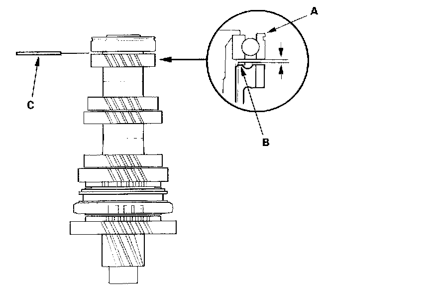 16. Measure the clearance between the old bearing (A) and the 35 mm shim (B) with a feeler gauge (C).