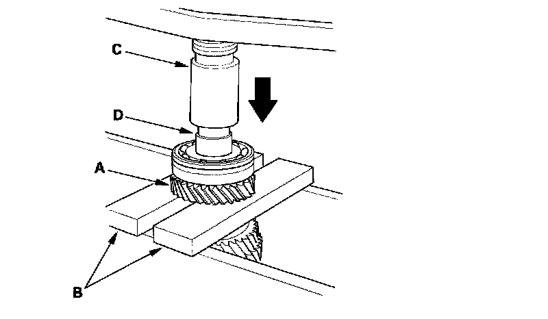 18. Support the 6th gear (A) on steel blocks (B), then use a press (C) and an attachment (D) to press the countershaft out of the ball bearing.