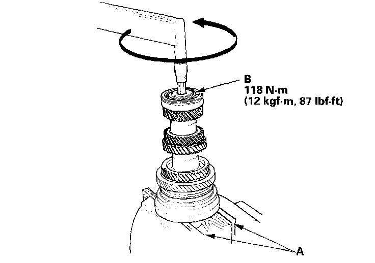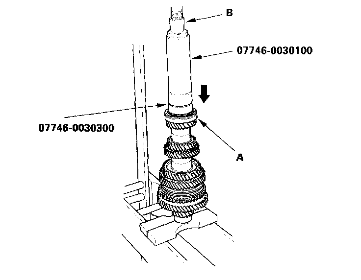 14. Install 6th gear (A) using a special tools and a press (B). Do not exceed the maximum pressure.