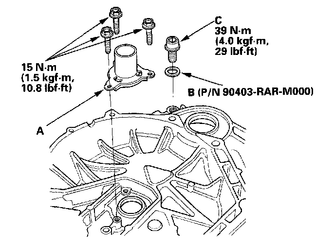 1. Install the release bearing guide (A), new drain plug washer (B), and drain plug (C).