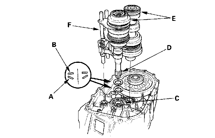 4. Apply vinyl tape the mainshaft splines (D) to protect the seal. Install the mainshaft and countershaft (E) into the shift forks (F), and install them as an assembly.