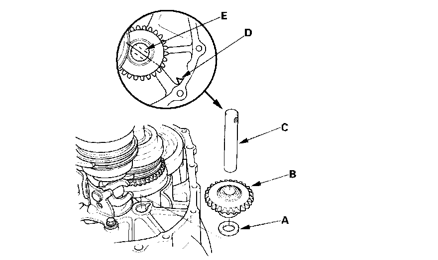 6. Install the 20 x 36 x 2 mm thrust washer (A), reverse idler gear (B), and reverse gear shaft (C) by aligning the mark (D) with reverse gear shaft hole (E).