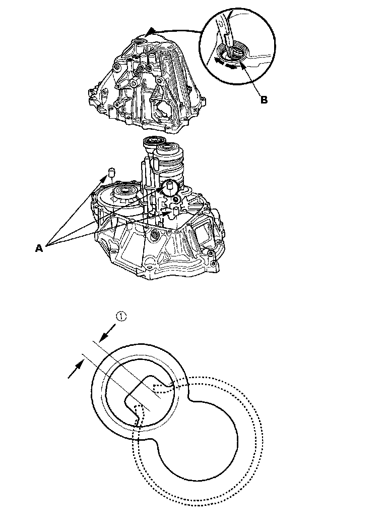 NOTE: If 4 minutes have passed after applying liquid gasket, reapply it and assemble the housings. Allow it to cure at least 20 minutes after assembly before filling the transmission with oil.