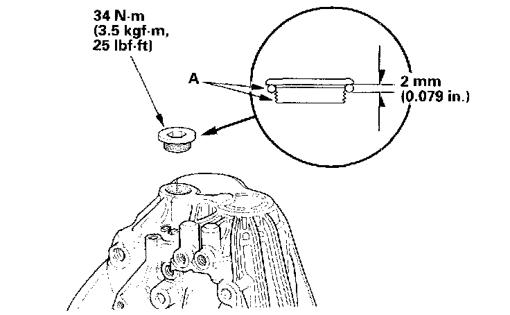 13. Apply liquid gasket (P/N 08718-0001) (A) to the threads, and a 2 mm (0.079 inch) bead around the contact surface. Install the 32 mm sealing cap on the transmission housing.