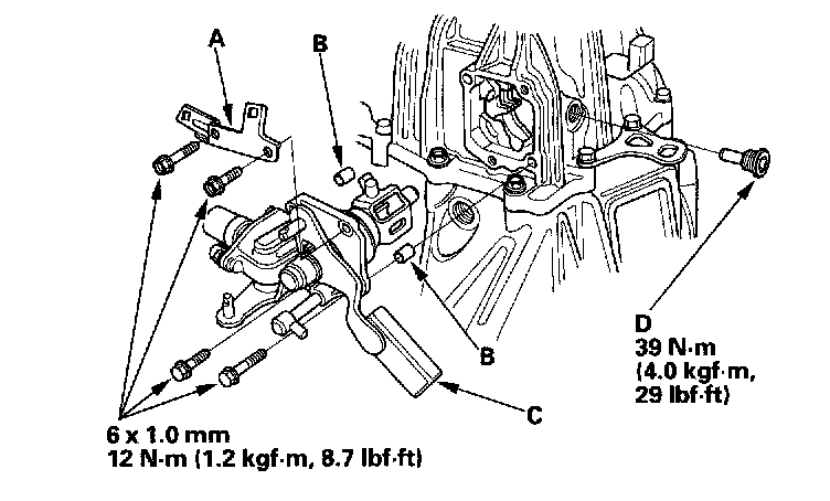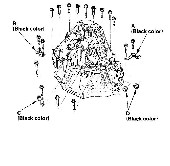 14. Install the transmission hangers A and B, harness bracket B (C), mount bracket collar (D), and 8 mm special bolts (left-hand threads) finger-tight.