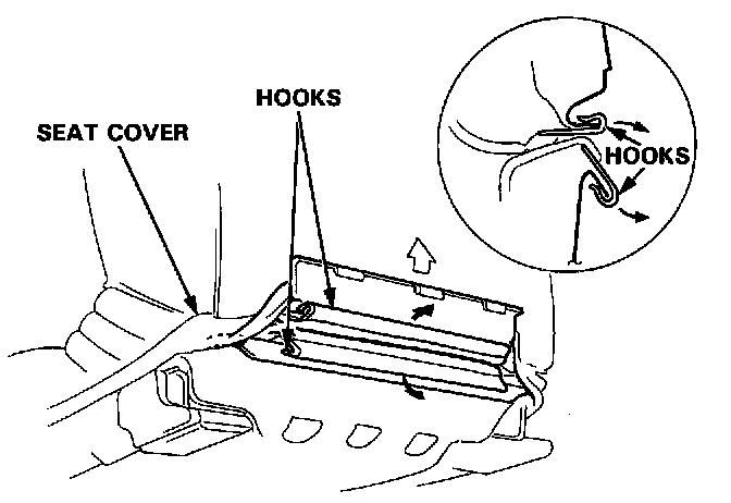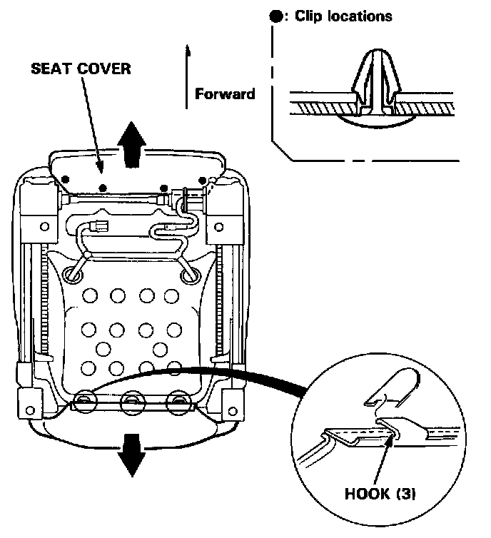 1. Detach the clips and hooks from under the seat. Pull the seat cover back.