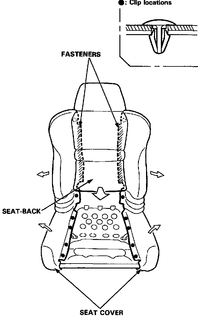 6. Detach the clips from the seat-back, then pull the seat-back cushion up as shown. Remove the retainers, then remove the headrest by pulling it up. Remove the fastener on the left side.