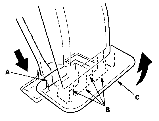 3. Push the knob (A) back to release the hooks (B) then pull up the accelerator pedal (C).