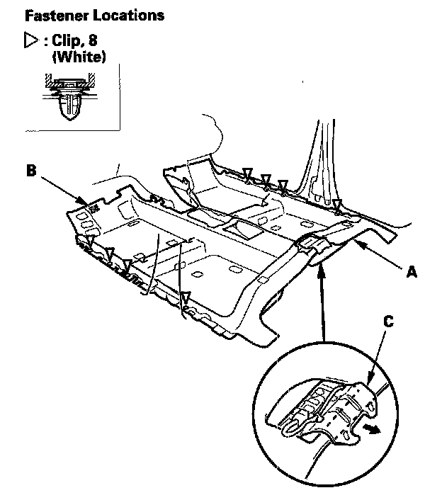 5. Detach the clips on both sides of the carpet (A). Pull the fastener (B) out, and pull out the carpet from under the plate (C), then remove the carpet.