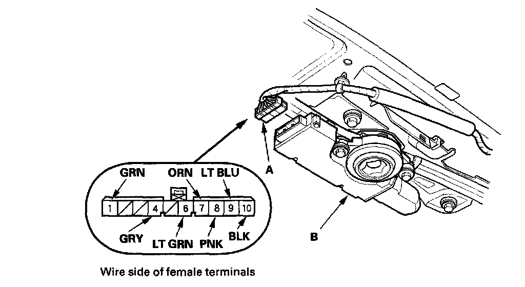 3. Disconnect the 10P connector (A) from the moonroof control unit (B).