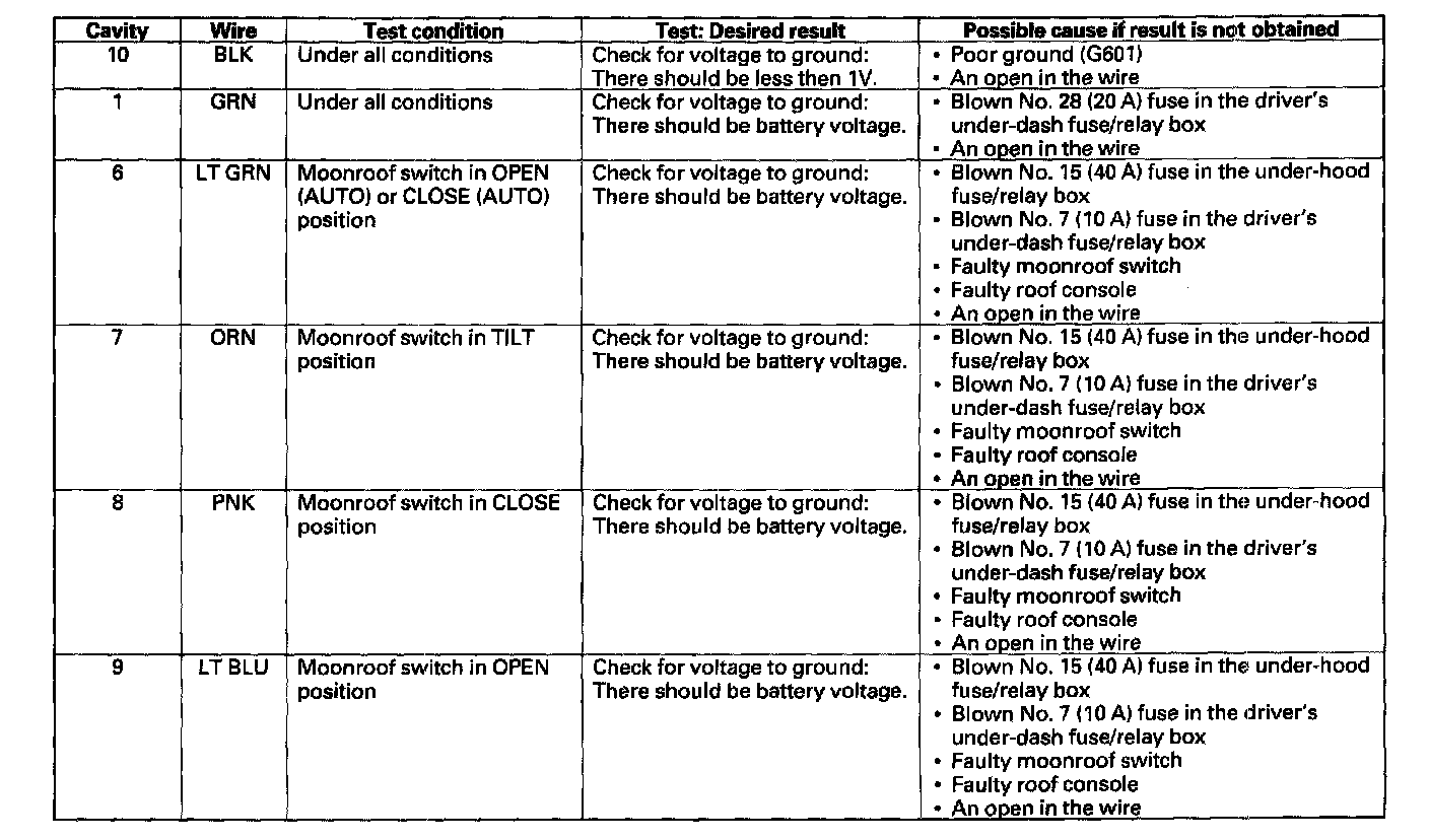 If the moonroof works OK manually, but will not work in AUTO, or reverses frequently (pinch detection) do the moonroof calibration before proceeding with the input test.