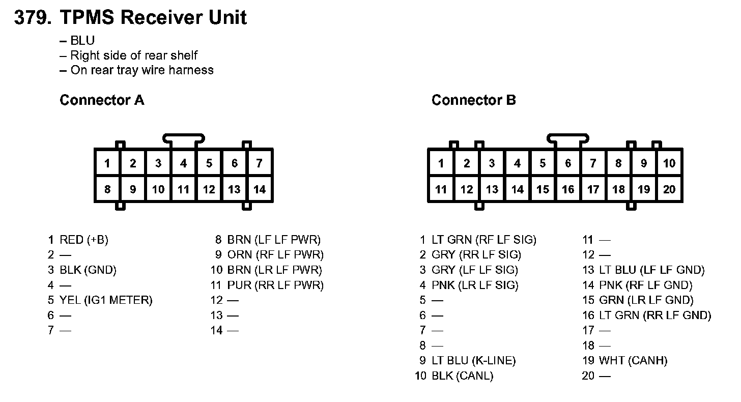 TPMS Control Unit Inputs and Outputs for Connector B (20P):