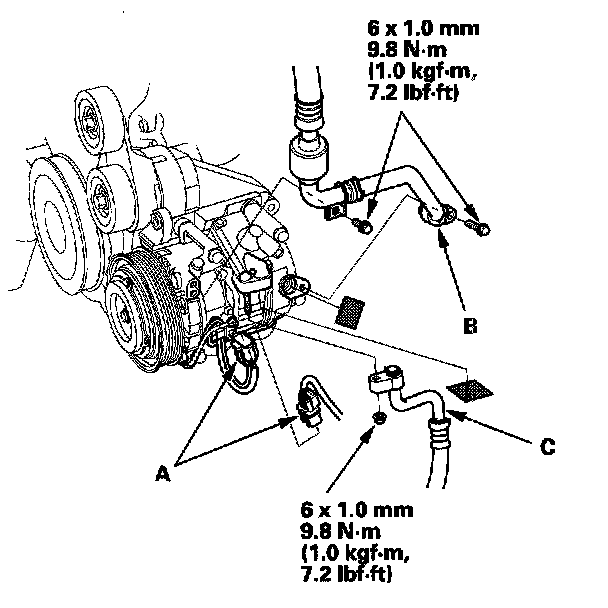 7. Disconnect the A/C compressor clutch connector (A). Remove the bolts and the nuts, then disconnect the suction hose (B), and discharge hose (C) from the A/C compressor. Plug or cap the lines immediately after disconnecting them to avoid moisture and dust contamination.