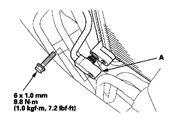 6. Remove the bolt, then disconnect the receiver line (A) from the A/C condenser.