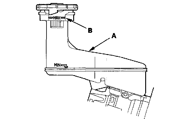 1. Make sure the brake fluid level in the reservoir (A) is at the MAX (upper) level line (B).