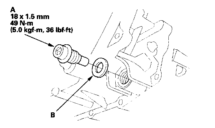 6. Install the ATF filler bolt (B) with a new sealing washer (C).