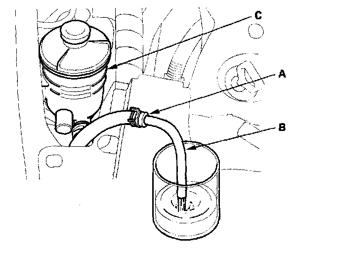 2. Connect a hose (B) of suitable diameter to the disconnected return hose, and put the hose end in a suitable container.