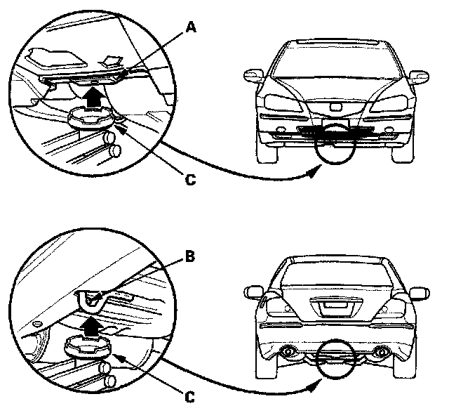 3. Position the floor jack under the front jacking bracket (A) or rear jacking bracket (B) Center the jacking bracket in the jack lift platform (C) and jack up the vehicle high enough to fit the safety stands under it.