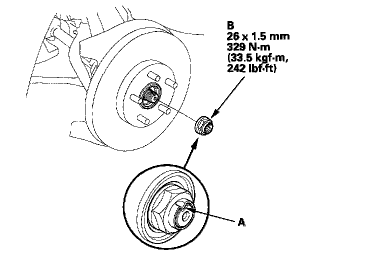 ^ Before installing the spindle nut, apply a small amount of engine oil to the seating surface of the nut. After tightening, use a drift to stake the spindle nut shoulder against the driveshaft.