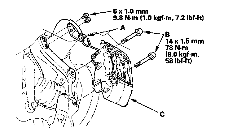 4. Remove the brake caliper bracket mounting bolts (B), and remove the caliper assembly (C) from the knuckle. To prevent damage to the caliper assembly or brake hose, use a short piece of wire to hang the caliper assembly from the undercarriage. Do not twist the brake hose with force.