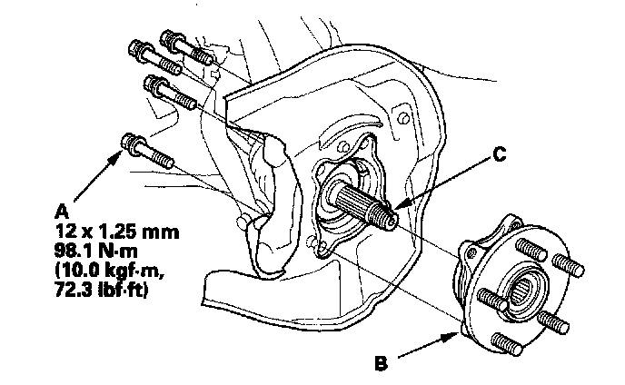 11. Remove the hub bearing unit (B) by tapping the driveshaft end (C) with plastic hammer while drawing the hub bearing unit outward.