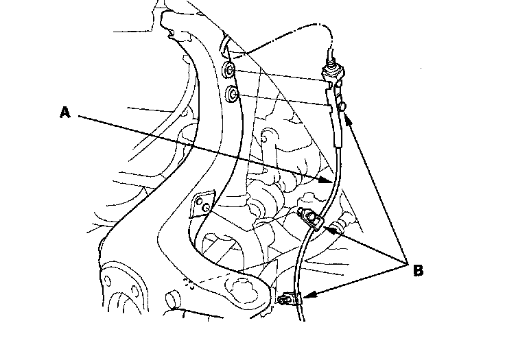 5. Remove the wheel sensor (A) and O-ring (B) from the knuckle. Do not disconnect the wheel sensor connector.