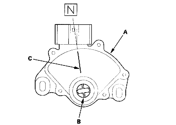 13. Set the new transmission range switch (A) to the N position. The transmission range switch clicks in the N position, and the selector control shaft hole (B) aligns with the N position line (C).