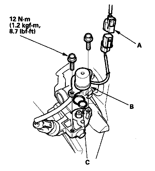 Rocker Arm Oil Control Solenoid (VTEC Solenoid Valve) Replacement1. Disconnect the rocker arm oil control solenoid (VTEC solenoid valve) connector (A).