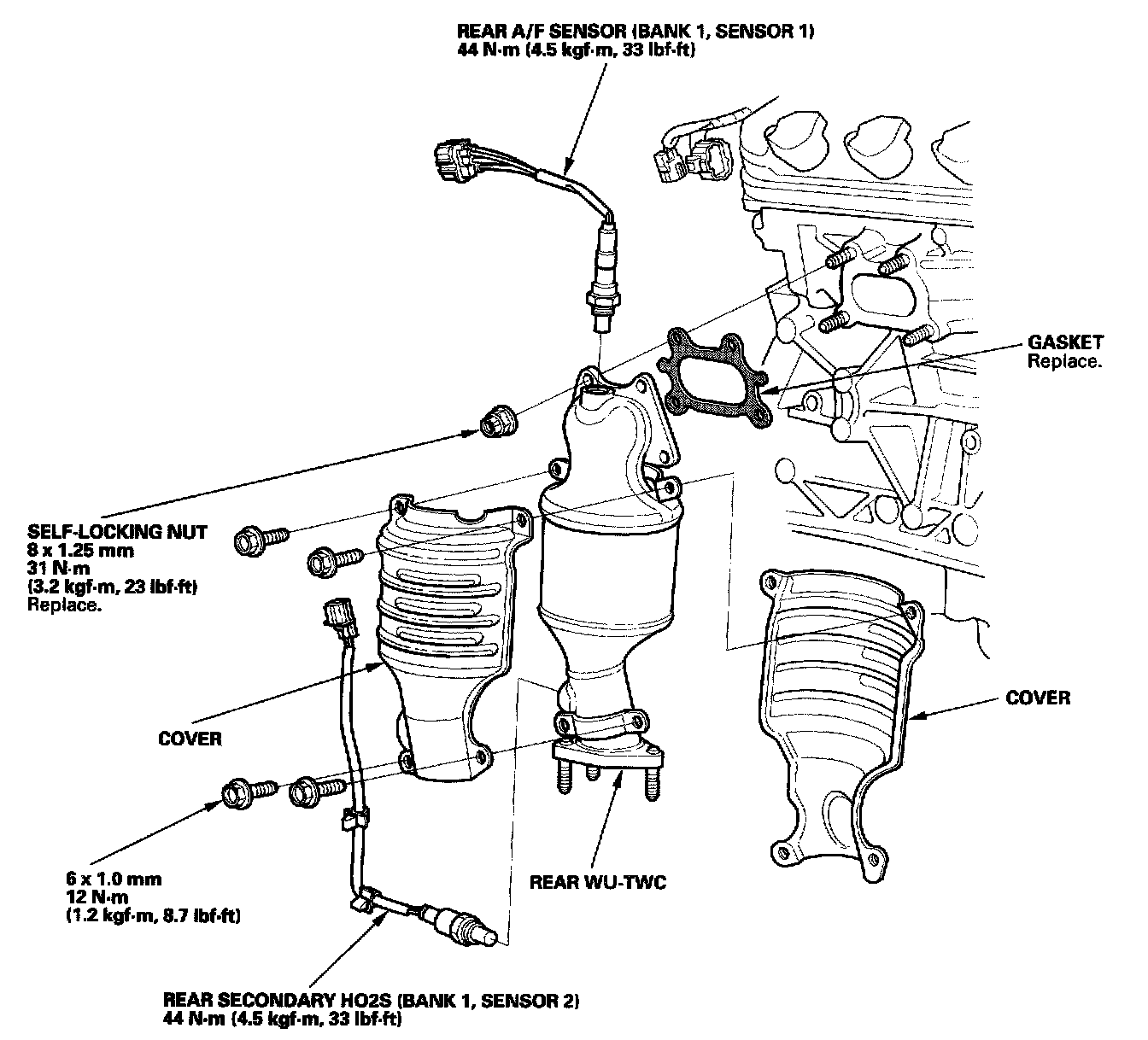 2. Disconnect the rear air fuel ratio (A/F) sensor connector and rear secondary heated oxygen sensor (secondary HO2S) connector.