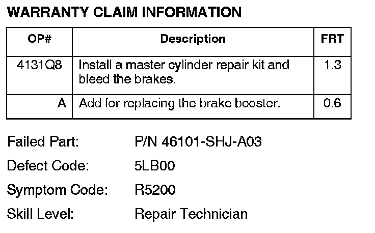 Recall - Potential Brake Master Cylinder Leaks: Overview