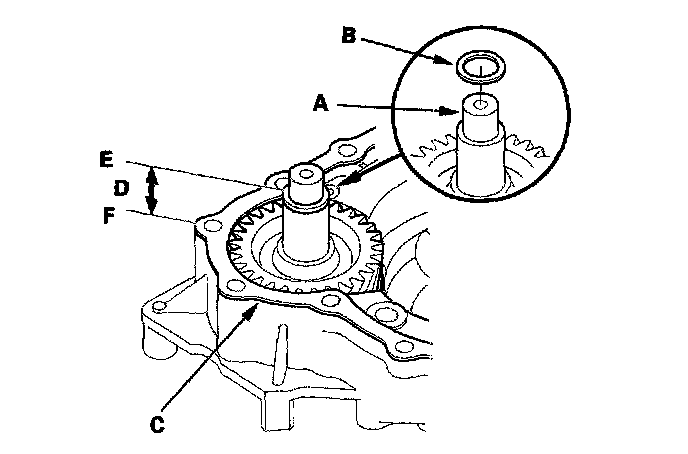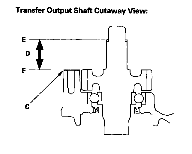 3. Measure the height (D) of the transfer output shaft installation between the surface (E) of the gasket and the top (F) of the 28.5 mm thrust shim in at least three places. Use the average as the actual height,