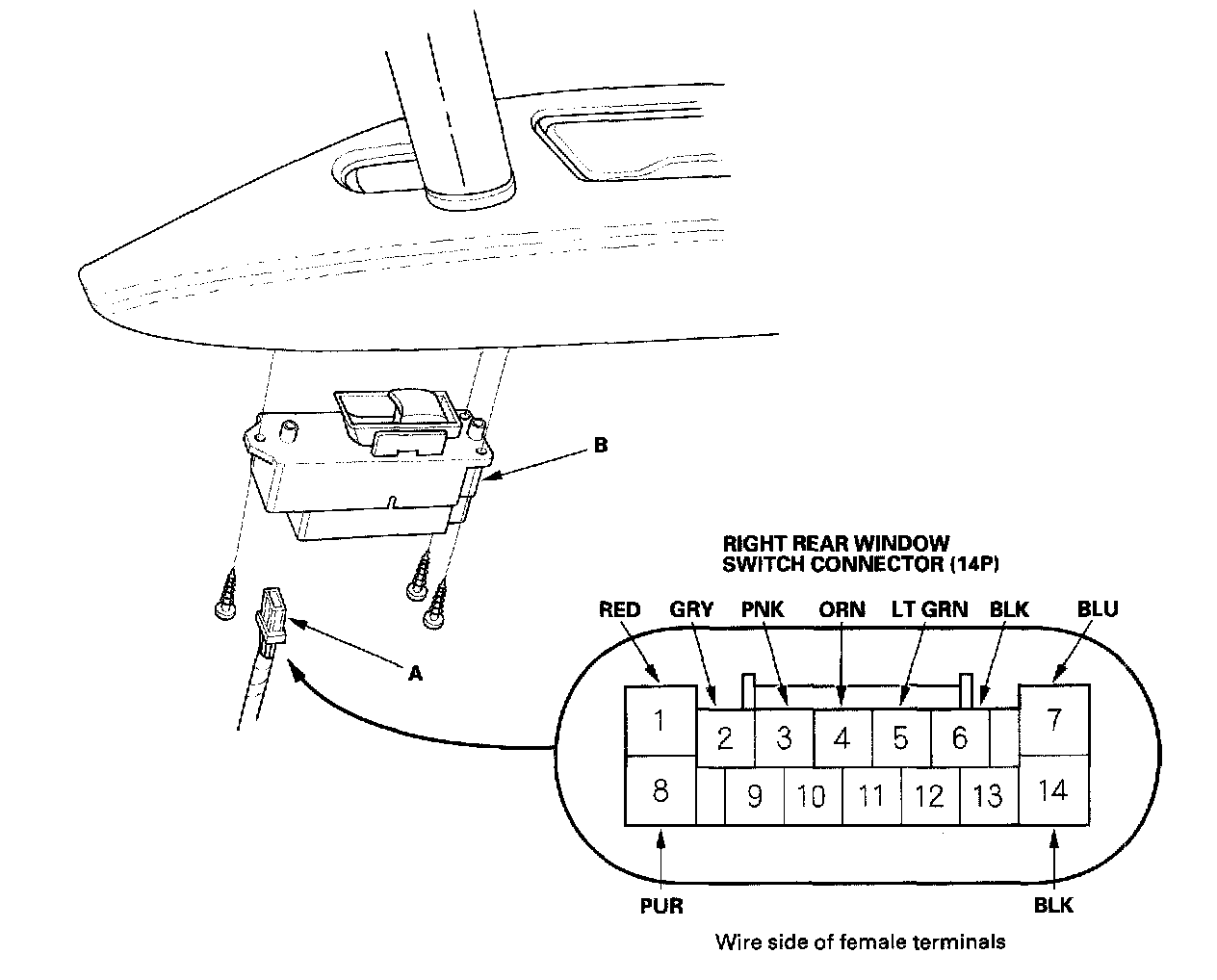 3. Disconnect the 14P connector (A) from the right rear window switch (B).