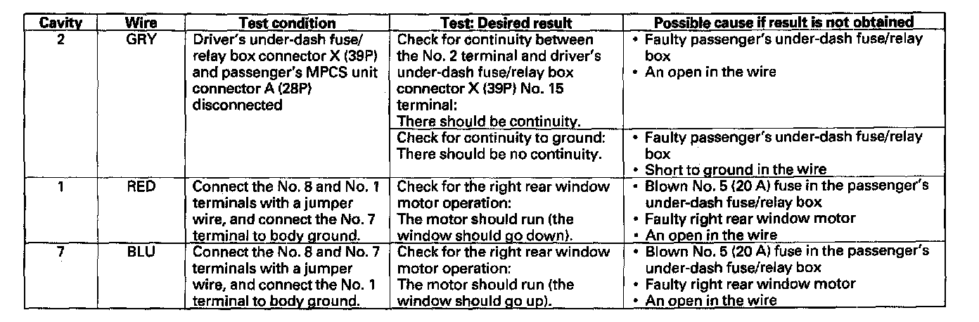 - If all the input tests prove OK, the right rear window switch must be faulty; replace it and go to step 7.