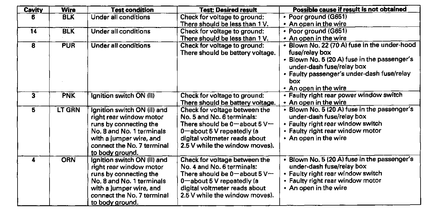 6. Reconnect the connector to the right rear window switch, and make these input tests at the connector.