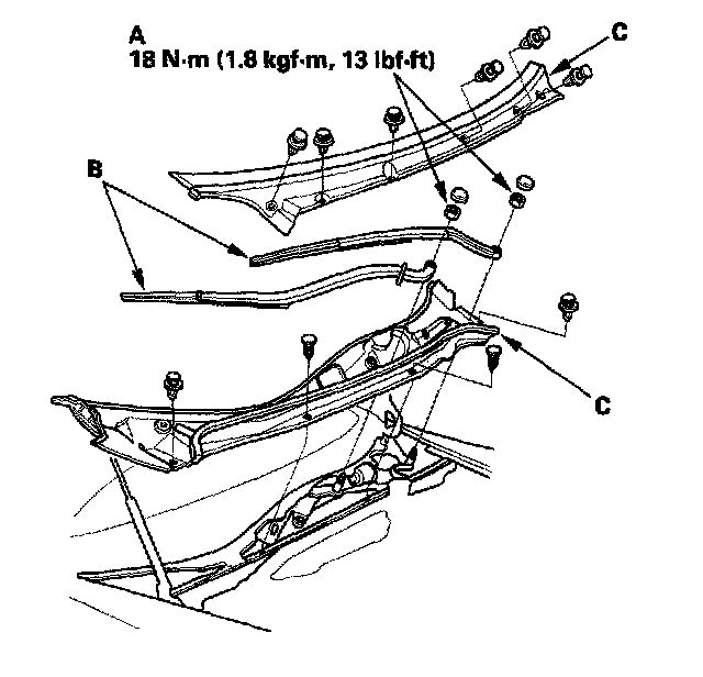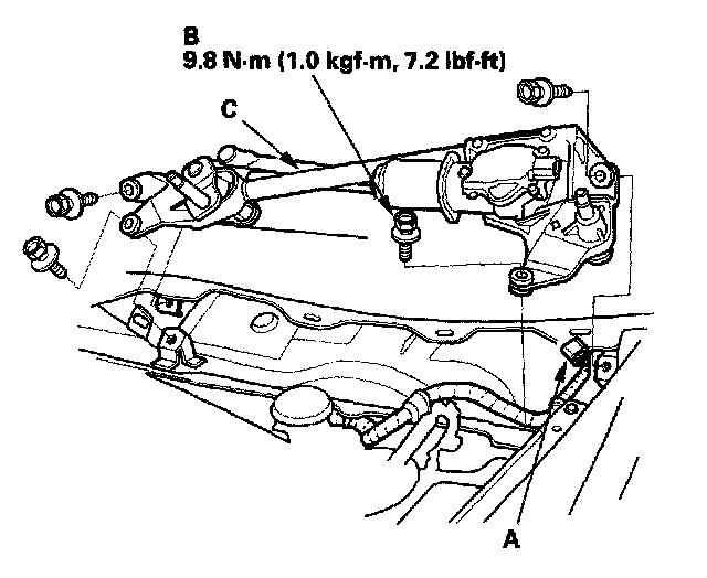 5. Remove the four bolts (B) and wiper linkage assembly (C).