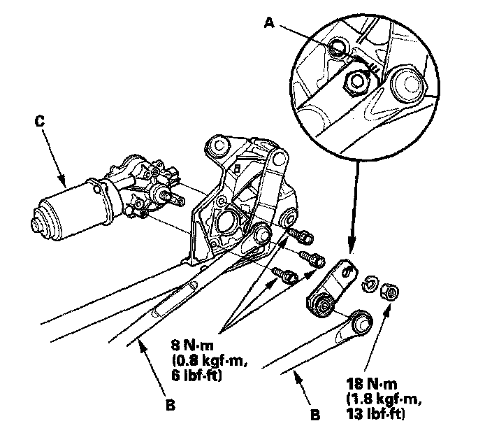 6. Scribe a line (A) across the link and windshield wiper linkage to show the original adjustment. Separate the windshield wiper linkage (B) from the wiper motor (C).