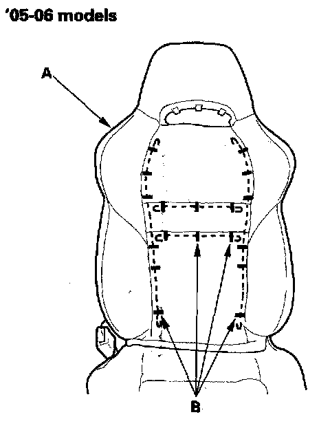 6. 05-06 models: Release the hooks (A), and release the seat-back cover (B) from the wire loop (C) on the seat-back frame. Release the fasteners (D), and then pull back the seat-back cover.