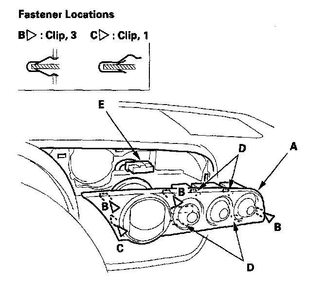 2. Disconnect the climate control unit connector (E), then remove the panel.